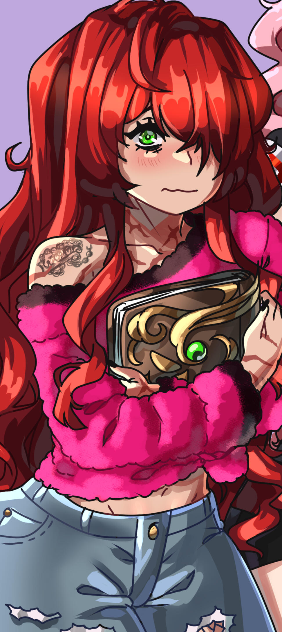 Matcha is a dinosaur girl who grew up in Tokyo. She lost her parents at an early age and was forced to grow up alone, leading to her having a "the stronger one wins" mentality, believing only strength can lead someone to the top.Due to this when she became a magical girl she was always up front fighting things with her magical gauntlets that weighed more than her herself.When the invasion begun and nova came down, it wasn't long before she fell for Novas temptation, moving over to her side and willingly letting nova corrupt her.With corruption she gained access to portals and a small pocket dimension, which she can access through the marks on her body.Matcha is a force to reckon with, and will punch first and ask questions later.
