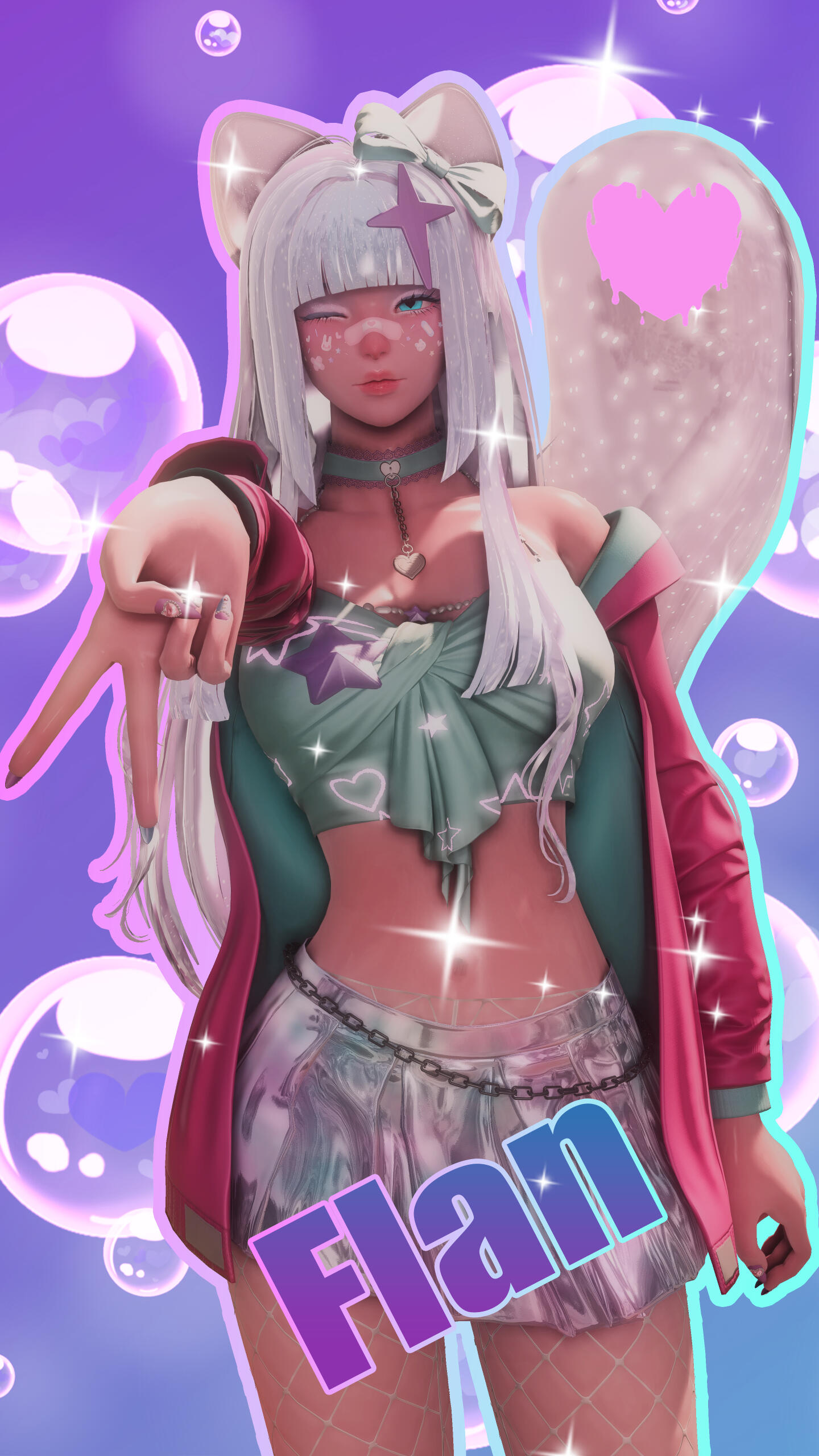 Flan is a slime girl who grew up in the city close to Peaches.As Flan grew up she became more enamoured with the cutesy aesthetic, dying her own slime to be pink and blue instead of the natural pink she was born with, this is why her hair tail, and even ears are so differently hued from her body.Both her and peaches became magical girls, while peaches magical powers are stored in her cowbell, flans are stored in her hair pin. It's rare to ever see her without due to this reason.Flan has a voracious appetite, easily able to consume more then her own body weight in food and will often rack up a large food bill when eating out.